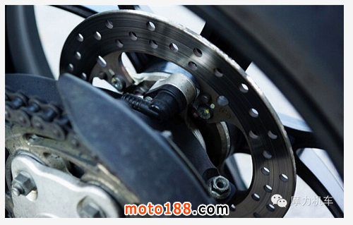 后碟盤則位于齒盤后方,為 245mm的固定碟盤,時速表的速度感應器也位于此處;而原廠對時速表的部份,也直接在原廠車主手冊說明,在儀表板上看到的時速為 +8% 于真實時速,也就是若真實騎到時速100KM/h,儀表板會顯示 108KM/h。