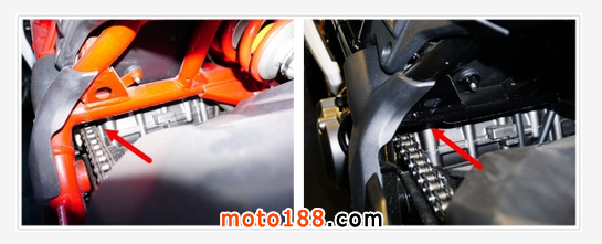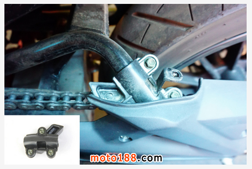 老款BJ300GS在鏈條松弛的情況下,會導致鏈條與車架、后搖臂接觸性磨損,上圖為錢江貝納利在數月前加裝的后搖臂防磨損組件。