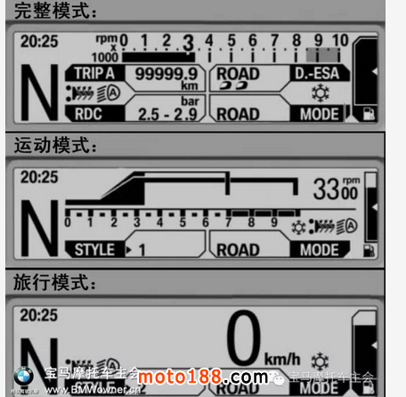 R1200RS的車載電腦可以在不同的儀表模式下,讓儀表盤顯示完全不同的內容。 在完整模式下里程表,小里程表,剩余燃油里程,發動機溫度,速度,油耗,胎壓等等所有細節全部顯示。而在運動模式下則以顯示圖形化的發動機速度圖表最為醒目輔以其他簡單行車狀態。旅行模式則更加簡化,儀表盤上只有檔位和速度部分面積較大,其他狀態兼顧顯示。當然,更專業的包含計時器,電壓監測,自動里程記錄等功能儀表也是作為選配供買家購買。