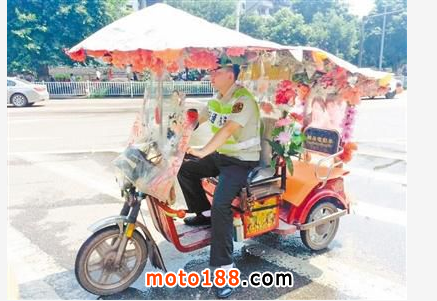 走近一看,這輛醒目的三輪車還真是讓人眼前一亮。車頭處安裝了一把遮陽傘,與座位后方的塑料棚連接在一起,頂部粘滿了五顏六色的假花,前后的擋風板上還貼了不少明星的貼畫。從正面望去,前方的透明隔板上赫然八個大字:“美麗中國、漂亮永川”。
