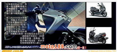 核心提示: 對于喜愛Suzuki綿羊車迷,如果你覺得AN650和AN400都太笨重的話,那么Burgman 200便是理想的綿羊。200級綿羊的座下可以橫置收
