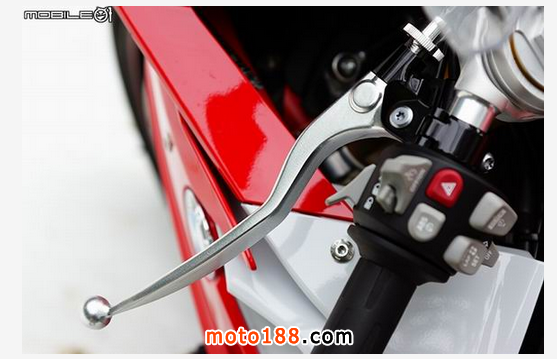 左把手部分,可以看得到鋼索離合器拉桿,以及復雜的左把手開關組;仿賽車款到目前為止大多都使用鋼索離合器,其中之一是因為鋼索離合器重量較油壓離合器輕一些,且鋼索離合器能從拉桿端帶給騎士最直接的離合器接合狀態,讓騎士能夠更精準的掌握離合點。