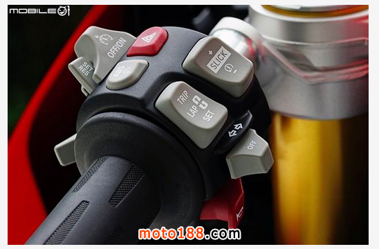 左把手開關組非常復雜,最前端為遠燈/近燈/超車燈開關,上端到下端一一介紹起,分別是定速控制系統開關及調整速度范圍撥鈕、警示燈開關、ABS 模式調整開關、儀表板功能切換及單圈時間閱覽按鈕、DTC 循跡系統介入幅度調整按鈕、方向燈開關以及喇叭按鈕,關于定速控制的啟用范圍為 30KM/h~210KM/h 內,調整范圍則是以撥鈕每按一次就調整 1KM/h 為主,其余功能將在后端再作解釋。