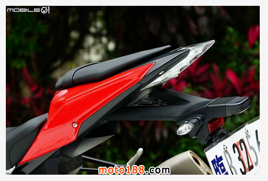 油箱及下方的車體設計方面,也大膽采用全新的車體設定,除了將油箱整流罩稍微改變型狀外,坐墊與油箱間的距離也非常緊致,充滿戰斗氣息。