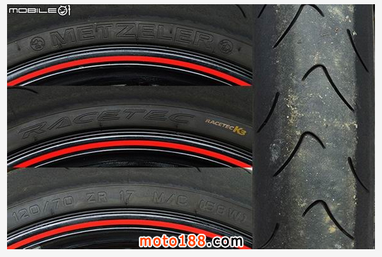 原廠前輪搭配的是 METZELER 德國象牌輪胎,型號為 RACETEC K3,規格則是 120/70 ZR17 M/C 58W,胎紋可以參考右側部分,屬于比較競技型的輪胎胎紋分布。