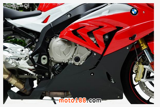 S1000RR 的側面最引人注目的就是右側整流罩鯊魚鰓設計,讓人非常印象深刻,而這樣設計的車體在熱量導出方面也有顯著的效果,盡管壓縮比是較高的 13.0 : 1,但引擎溫度在夏日騎乘還不算過燙。