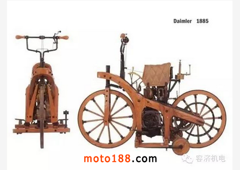 我們今天騎的摩托車,其實在100多年前就被發明出來了。1885年戴姆勒制造出一臺氣冷型直列單缸二沖程內燃機,最大功率0.38千瓦。他將這臺發動機安裝在由橡木制成的車架和木制車輪的雙輪子車上,制成了實際上是世界上第一輛摩托車,最高時速可達12公里。