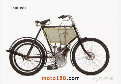 1901年的摩托車,不知道是否該稱之為摩托車,它實在是太像二八自行車了。