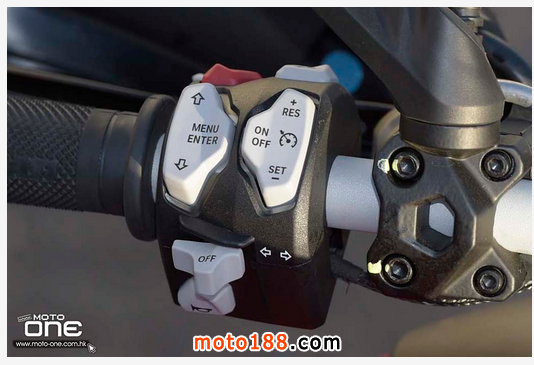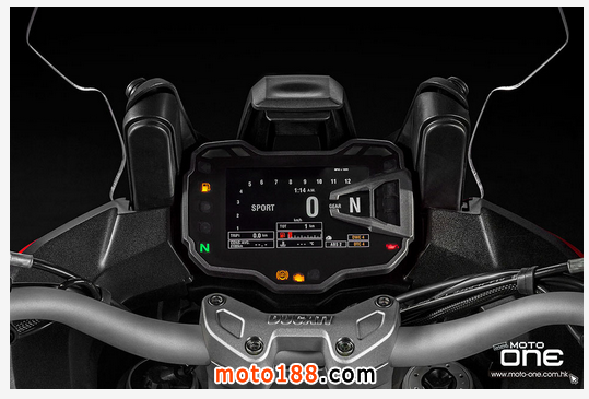 以傾角照明大燈為例,當行車電腦感應車身傾則入彎時便啟動車頭的LED燈,照明黑暗的彎角,提高行車視野,這功能類似四輪上的照明系統。而Cornering ABS同樣是根據車身轉向角度電腦不斷地進行調校,可避免騎士在攻彎時過度扣下掣動桿,導到失去慣性轉向力引致Lowside意外。除此之外,今代車輛還有Ducati Wheelie Control (DWC)8段調校的防起頭功能,而高速公路定速巡航按鈕可讓車輛自動行駛,還有今代車輛采用無匙啟動車輛,并可遙遠控制打開座椅。另外,車輛還加入多媒體功能Ducati Multimedia System (DMS),透過籃芽連接手機後(適合Android及IOS使用),彩色儀表成為多媒體屏幕,可聽歌、接收朋友訊息及接聽電話等等,DUCATI還特設網站,讓騎士分享行車資訊如行駛路線等等。