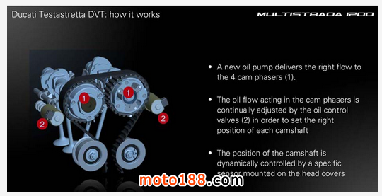 ●根據廠方介紹,新的DUCATI Desmodromic Variable Timing搖臂式可變正時控制系統可提升7%馬力及9%扭力,但可節省8%耗油量。