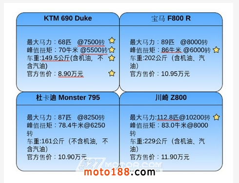 690 Duke這車怎么樣?不妨與寶馬F800 R、杜卡迪Monster 795、川崎Z800等國內同級別車型從數據上對比來看: