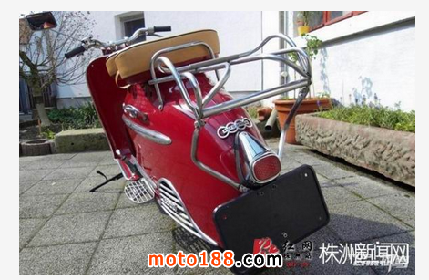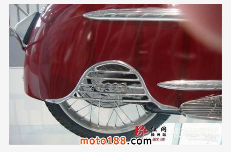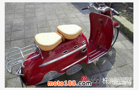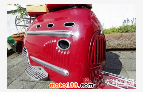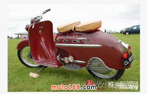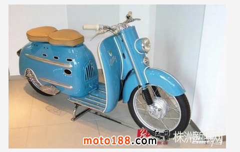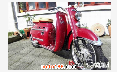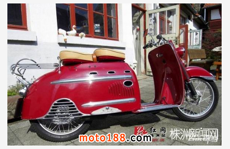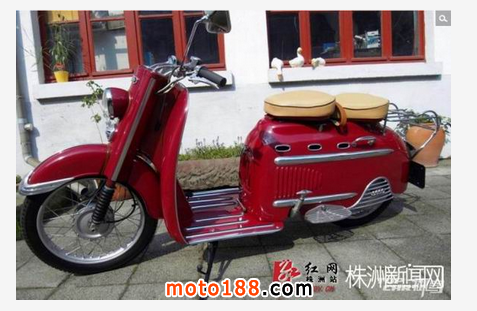 請輸入這臺紅色踏板車的全稱是DKW Hobby,1955年由德國奧迪汽車出品。此車是采用2沖程發動機的踏板摩托車,做工精致嚴謹,用料扎實,成為現在歐洲很多車迷的熱捧車型。1954-1957年間,奧迪共生產了45303臺DKW Hobby。