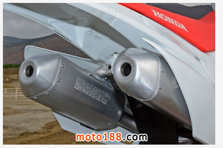 動力方面,2016款CRF450R搭載的449cc、四缸四沖程單杠引擎和2015款車型完全一樣,同樣的缸徑和沖程以及同樣的12.5:1壓縮比。鈦合金進氣門和鋼材料排氣門也都和2015款車型相同,唯一不同的地方就是2016款車型換上了雙出排氣。動力的低扭輸出表現同樣的出色,本田的發動機模式選擇系統(Engine Mode Select)在2015款車型上就已經裝備了,這套系統可以提供三種不同的性能表現,并且只需要通過車把上的開關就可以選擇。CRF的的制動盤依舊保持了前260mm后245mm的配置,可以提供足夠的制動力,鄧祿普GEOMAX MX52越野輪胎是應對越野場地的最佳選擇之一。