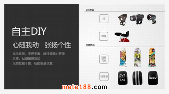 同時,為了迎合年輕人的個性需求,Citycoco還可以自主DIY,讓用戶根據個人喜好,完成產品改裝,只需動動手指,瞬間變身改裝達人。充電系統、手把手套、噴漆等隨心更換,后座、貼圖也可以隨意添加,讓用戶玩的就是個性,玩的就是創意。