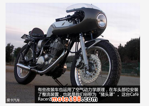 現在看來平白無奇,但在當時,這樣的一個稱號可以說是“無上的榮耀”。所以為了它,眾多愛好者開始對自己的愛車進行重度改裝,以得到更快的速度。那些退伍士兵的機械知識則得到充分發揮。在不斷摸索以及GP比賽的啟示下,他們認為將車把設計成分離式,油箱形狀細長且兩側帶有凹槽(讓膝蓋可以緊貼油箱)的形式最為出色。