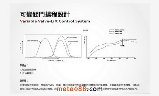 低速時所需要的氣流較少, 所以使用低角度的凸輪軸,高速時所需要的氣流較多, 所以使用高角度的凸輪軸,用這種方式來兼顧低速扭力和高速的馬力表現。