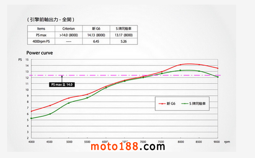 活塞也進行了輕量化,讓新G6的引擎馬力, 比前代更為提升。就算是測量后輪的馬力輸出,也有很大的提升。