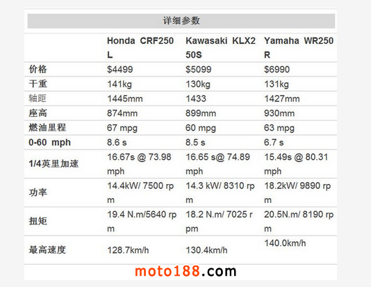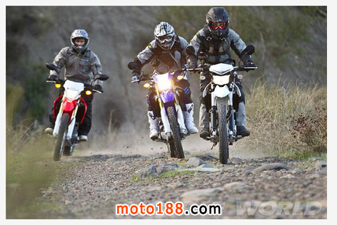 為了廣大車友在挑選探險(xiǎn)工具時(shí)不至于迷茫,我們挑選了三臺(tái)具有代表性的運(yùn)動(dòng)越野車進(jìn)行一次對(duì)比測(cè)試,希望對(duì)車迷們?cè)谶x車時(shí)會(huì)有所幫助。很大程度上來(lái)說(shuō),這三款車均是現(xiàn)代高科技產(chǎn)物。它們分別是售價(jià)4499美元的Honda CRF250L,售價(jià)5099美元的Kawasaki KLX250S,以及三者中售價(jià)最高的Yamaha WR250R,6990美元。