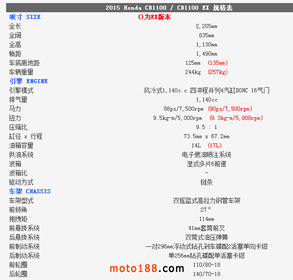 HONDA CB 1100EX及CB1100同樣採用四沖程風(fēng)冷1,140cc并列4汽缸DOHC 16氣門引擎,當(dāng)中以CB 1100EX復(fù)古味最濃,原因是採用前后鋼線輪框,並且使用了較高座高的格仔麵包座墊,除此之外還有4出2排氣管,從正方及后方看車輛有更佳平衡感。而擁 有較現(xiàn)代化外型的CB1100則使用4出1排氣管、合金輪框及平滑的高低級座墊。