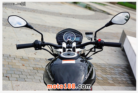 來到騎士視角部分,儀表板的面積不大,不太會占據(jù)過多騎乘目光,把手采用寬把設計,騎乘時的騎姿三角還算舒適,上三角臺更采用全鋁合金制成,并且還有鍍鉻拋光設計,在大白天下有像鏡面般的效果,油箱造型也非常好夾,而且腳部會接觸到的地方還是油箱罩而已,略有進口車的設計水平。