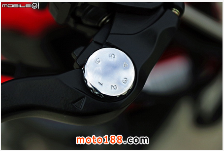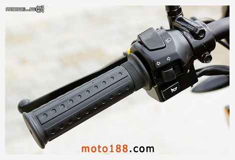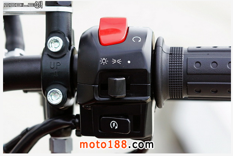 左把手部分,把手尾端并沒有配置平衡端子,左邊的開關配置從上到下分別是遠燈/近燈切換開關、方向燈開關與喇叭按鈕,與大部分的街車并沒有很大差異,很輕松就能上手。