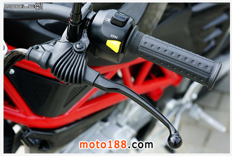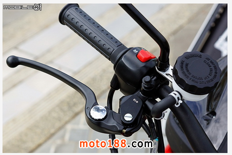 右把手為前煞車總泵部分,總泵采用分離式油杯,總泵口徑從總泵上標示可以發(fā)現(xiàn)為直徑 19 的總泵,煞車力道也的確讓人有深刻印象。