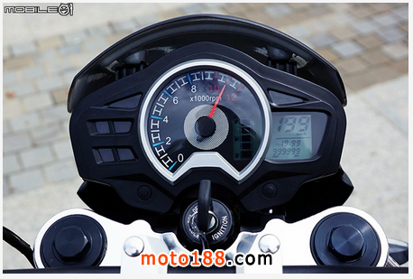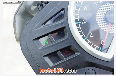 儀表板采用多功能的轉(zhuǎn)速指針時速數(shù)碼液晶儀表板,儀表板的轉(zhuǎn)速在 10000rpm 時進入紅線區(qū),表底為 12000rpm,數(shù)碼顯示區(qū)域則能顯示油量、時速表、時間以及單趟里程/總里程,左半邊的區(qū)域則有遠燈、引擎故障以及空檔提示燈。