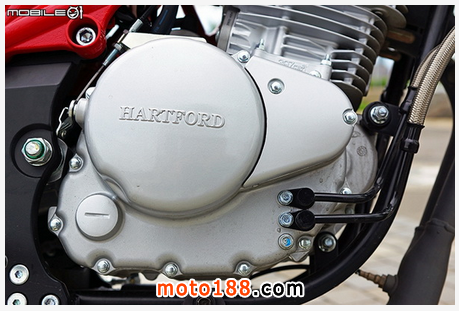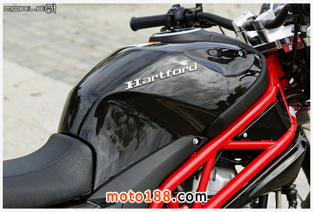 接著看到油箱部分,在油箱外罩也采用進口重車近年常見的雙層油箱設計,外罩為烤漆塑膠殼,若不慎倒車或者車禍時的維修費用也比金屬油箱便宜,上方還貼有哈特佛的商標,也因為是用貼紙貼上,若想要進行重新烤漆等也比較容易。