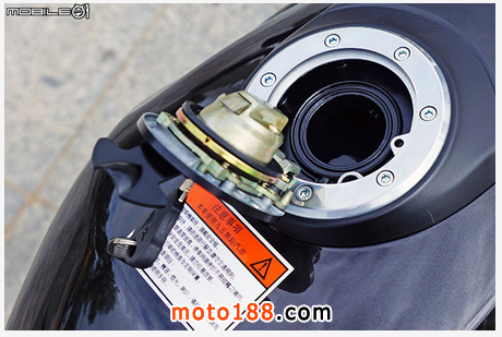 油箱蓋采用免手持設計,加油孔內(nèi)則因為是全塑鋼油箱緣故,所以看不到以往金屬油箱產(chǎn)生的亮面反光,油箱口與油箱蓋有著互相咬合的氣密橡膠 O 環(huán)固定,油氣也比較不容易從此蒸發(fā),下大雨也不用擔心從此處滲水。
