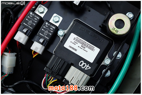 接著就可以看到 ECU 以及一旁兩顆繼電器,ECU 為 DELPHI 的 噴射系統(tǒng)引擎管理元件 ( EMS-Engine Management System ),采用十六位元計算引擎運轉(zhuǎn)效率,這顆代號 MT05 的ECU 在國內(nèi)外蠻多車廠也有使用,兩顆繼電則分別是控制汽油泵浦以及 ECU 送電。