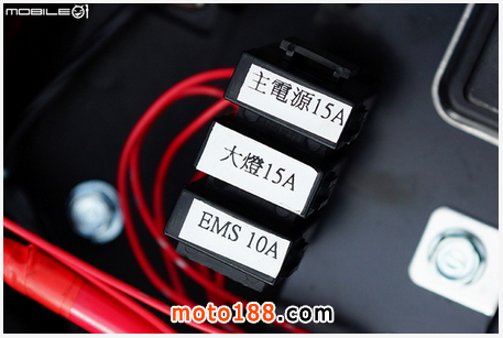 電瓶下方可以看到全車保險絲部分,目前配置為三組保險絲,分別是主電源 15A,大燈 15A,EMS 10A,保險絲都采用插片式保險絲,比起玻璃管保險絲更安全。