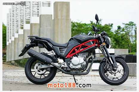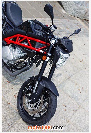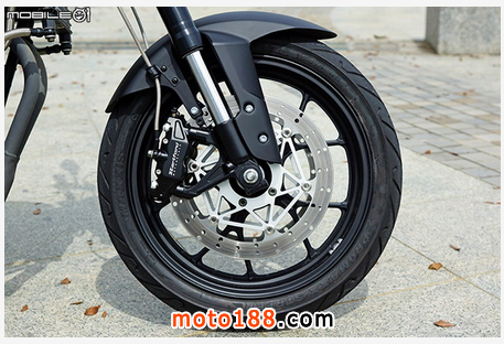 車輛的左側(cè)與右側(cè),鋼管編織車臺以紅色烤漆搭配,相信一開始就吸引不少人的目光,接著會看到前避震器使用倒立式前叉與雙碟配置,而且雙碟還采用輻射固定式對向四活塞卡鉗與金屬油管配置,讓人不注意都難,另外后搖臂與輪框造型也算是國產(chǎn)街車中用料與設計都蠻有意思的,厚實鋁合金搖臂與造型更簡約的輪框組,在這個售價之中更顯超值。