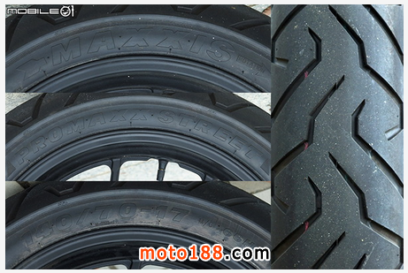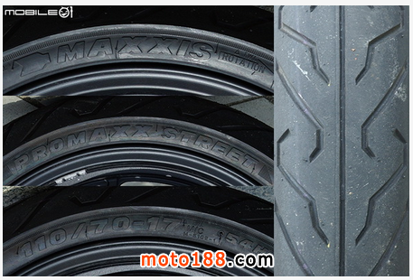 前輪采用 MAXXIS 正新瑪吉斯的 PROMAXXIS STREET 系列輪胎,規(guī)格為 110/70-17 M/C 54H,胎紋可以參考右側(cè),這條輪胎在目前國內(nèi)許多車款都作為原廠配胎,當然這個規(guī)格要改換其他性能較好的胎種也沒有問題。