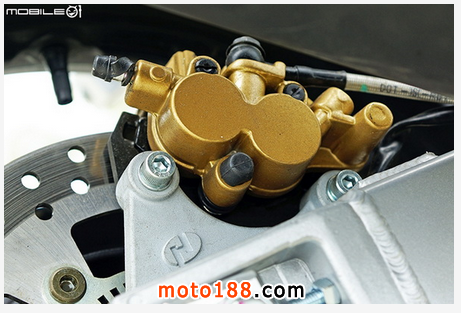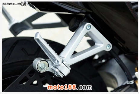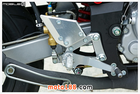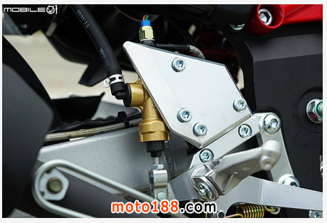 后煞車總泵位于翼型保護塊后方,總泵采用液壓煞車燈開關,可以省去調(diào)整傳統(tǒng)彈簧煞車燈開關的彈簧張力的問題,并且后煞車也采用金屬油管,省去一筆改裝費用,也增加耐用程度。