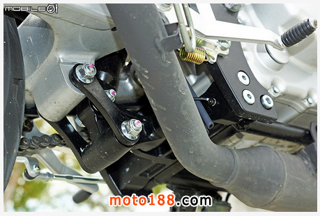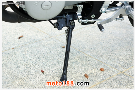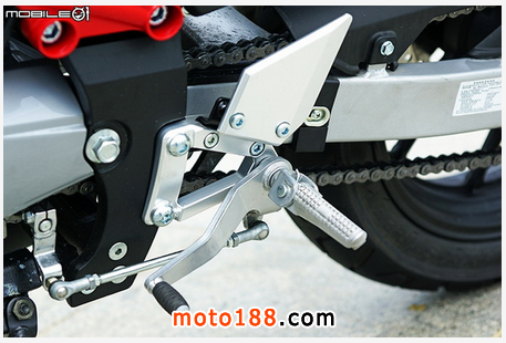 左側(cè)角踏及打檔桿部分,變速箱采用國際五檔配置,當然左腳踏翼形護塊也是采用鋁合金材質(zhì)制作,打檔桿的打檔順暢度也還不錯,空檔不算難找,但是一檔并未像他廠國際檔車款設計檔銷,因此進入一檔后若繼續(xù)踩踏打檔桿,踩踏行程會讓人誤以為還有檔位可以降而繼續(xù)踩踏打檔桿。