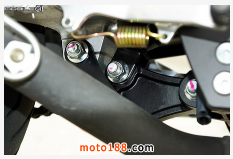 接著看到后搖臂下方避震器座的部分,原以為可能跟大多數(shù)國產(chǎn)中置避震的檔車一樣,直接鎖在搖臂上而已,結果卻令人意外的有搭載多連桿后避震啊!中置后懸吊系統(tǒng)加上多連桿避震器緩沖,更是增添避震器的運作效率,同時也讓騎乘感受會更為優(yōu)質(zhì)與穩(wěn)定。