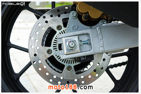 后輪碟盤采用 240mm 的固定碟盤,卡鉗則是單向雙活塞浮動式卡鉗,在碟盤中間有著一格一格的部分,這部分是時速表顯示用的霍爾效應傳感器,并不是仿間俗稱的 ABS 感應器,因為有這片不代表一定就有 ABS,有 ABS 的車款也不一定會看到這片感應盤及感應器,所以要判別還是以官方說明為準,別再被誤導了羅。