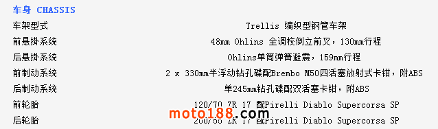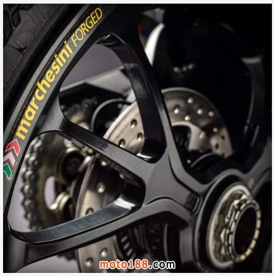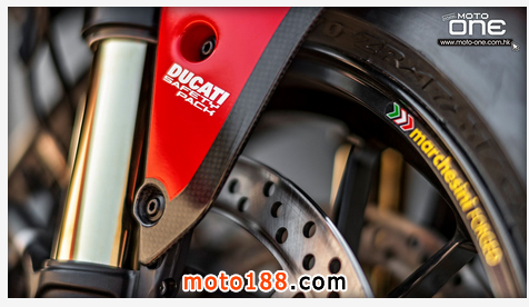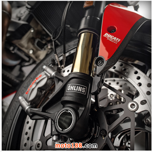 全新設計的車尾拜新副車架(乘托座位的部件)所賜,可縮短尾包圍及使之更纖巧,而輕量 化鍛造鋁合金輪框的造型與1299 PANIGALE相同,新車還採用更闊的200尾胎,S版採用190,相信是為了增加車輛在賽道上的咬地能力。還有更高級的前后ohlins避震,據資料 顯示有更長沖程,目的同樣是增加離地距。制動方面,與S版同樣配置了頂級的BREMBO M50煞車卡鉗及一對330mm煞車碟,尾制動是單245mm鉆孔碟配雙活塞煞車卡鉗,與1299 Panigale相同,而多段調校的循跡系統、馬力輸出及ABS等等應有盡有。