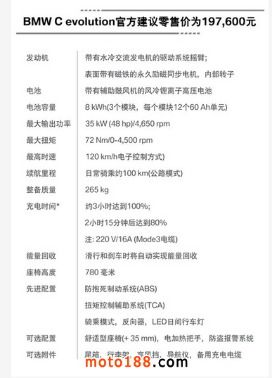 此次發布的BMW C evolution官方建議零售價為RMB 197,600元。