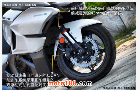 來自西班牙的J.JUAN制動系統,針對春風650TR-G國賓車民用版的需求進行特別調教,并配合同行業中頂級的德國大陸ABS防抱死制動系統,讓安全性得到了大幅提升。而業內著名的WP倒立式可調前叉、后減震讓操控更加出色。