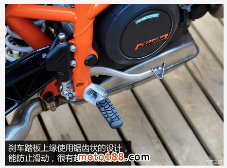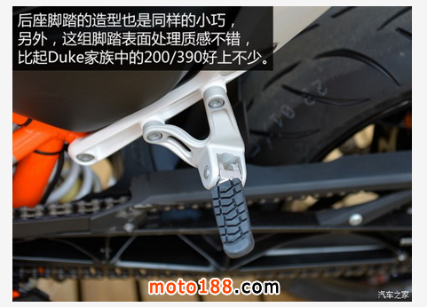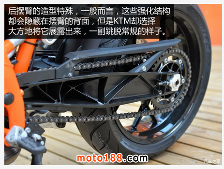 至于操控性,它騎起來(lái)不太像是騎著一輛大排量摩托車(chē)。輕量化是這輛車(chē)的最大優(yōu)勢(shì),它的鋼管車(chē)架只有9kg重而已,鋁合金后擺臂只有4kg,看得出來(lái)KTM對(duì)于車(chē)重的控制非常有一套。而單缸發(fā)動(dòng)機(jī)體積較小,曲軸長(zhǎng)度較短,所以發(fā)動(dòng)機(jī)運(yùn)轉(zhuǎn)的慣性也比較小,所以在傾倒車(chē)身準(zhǔn)備過(guò)彎的時(shí)候,你會(huì)覺(jué)得車(chē)身動(dòng)態(tài)非常的自然迅速,沒(méi)有什么費(fèi)勁的地方。