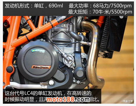 690ml排量的單缸發(fā)動(dòng)機(jī)在國(guó)內(nèi)的玩車(chē)風(fēng)氣中,的確不是非常討喜,但是這也成為它的最大特點(diǎn),發(fā)動(dòng)機(jī)中有一個(gè)直徑102mm的活塞,在摩托車(chē)發(fā)動(dòng)機(jī)中算是比較少見(jiàn)的,另外,雙火花塞也是這臺(tái)代號(hào)LC4單缸發(fā)動(dòng)機(jī)的特色之一。大單缸發(fā)動(dòng)機(jī)雖然扭矩輸出反應(yīng)迅速,但是高轉(zhuǎn)速延伸性還是有所不足,跟據(jù)我之前在海外試駕的經(jīng)驗(yàn),690 Duke的提速力度大約到了160km/h之后,會(huì)有明顯減緩的趨勢(shì)。