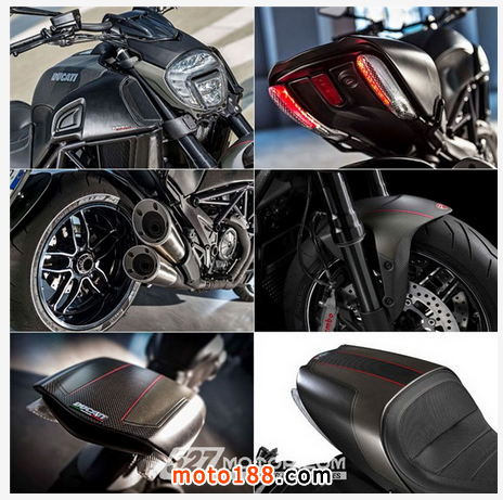 2016款Ducati Diavel Carbon唯一技術性的改動是頭段排氣,采用了Zircotec陶瓷涂層,座墊進行了重新設計。動力依舊搭載馬力為162匹的1198.4cc Testastretta 11°DS發動機,車重仍然為205kg。