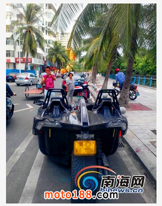 隨后,記者通過網(wǎng)上與照片比對,發(fā)現(xiàn)三亞出現(xiàn)的奇異車輛為“北極星”摩托跑車——Polaris Slingshot三輪跑,該車由美國雪地摩托及全地形車制造商--北極星(Polaris Industries)于2014年9月份上市推出,在美國起價23,999美元(約合人民幣14.8萬元)。有網(wǎng)友稱,在我國普通版售價約31萬元,高檔版約40余萬元。
