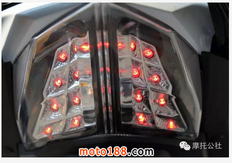 CK1-150的頭部和125造型和功能上都一樣,鹵素大燈加兩邊的LED眉燈。在大燈旁設(shè)置兩排LED眉燈似乎已經(jīng)成了光陽(yáng)的傳統(tǒng),在今年上市的賽艇300上也有同樣的設(shè)計(jì)。與125不同,150的尾燈升級(jí)為16顆LED燈珠,造型和效果有明顯提升。