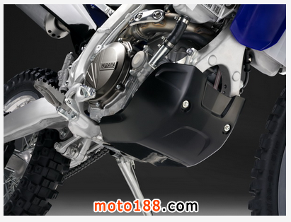 車身方面,采用了與 YZ450F 相同的車架/底盤與懸掛系統、但懸掛的設置略有不同。同時針對耐力越野的特殊性,為右側的散熱水箱配備了風扇、發動機底部加裝了護板和電啟動裝置,多功能的小型數字式儀表板、車頭的大燈、后剎車燈等也一應俱全,而這些都是越野賽車沒有的(或者說是不需要的)。全車的整備重量為 123 公斤,較 YZ450F 的 112 公斤要重。前、后輪框的規格也有所不同(WR450F 為前 21、后18,而 YZ450F 是前 21、后 19)。