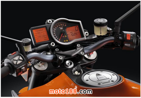 三種動力模式是必須的。與此同時牽引力控制和ABS的介入程度都可以配合各級動力模式進行微調,為車主營造出最個性化的設定。所有的信息都顯示在那兩塊碩大的LCD表板上,清晰易讀。一旦這些電控設備被打開,這頭野獸將變得容易馴服。而關掉ABS和牽引力控制系統后的超級公爵更能夠化身為一部超級滑胎車型。