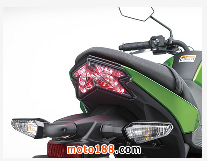 超有攻擊性的前臉將川崎Z系激進的設計風格展現得淋漓盡致,作為Z系家族的成員,另類、超前、個性的標簽與生俱來,哪怕是一輛迷你車!大燈并未采用時下流行的LED或者透鏡,而是把燈罩巧妙的設計成多面反射狀,以此來增強夜間照明效果。
