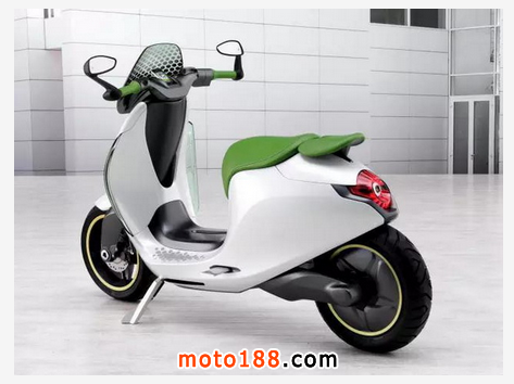 這款電動兩輪車被命名為escooter概念車,采用白色和綠色雙色調,與Smart fortwo電動版一樣,其擋風玻璃和車身飾板上帶有蜂窩狀紋路,大燈采用LED光源。