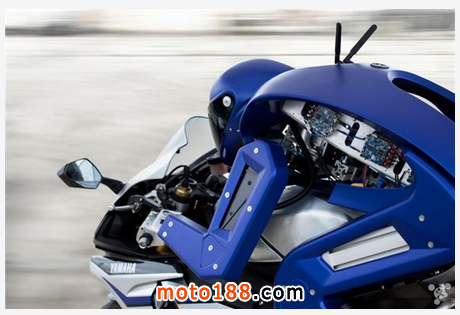 圖片上展示的正是這機器人駕駛經典的雅馬哈R1M的場景,如果不仔細注意它僵硬的線條和外露的電路,光看姿勢你還真以為那是個專業的騎手呢。